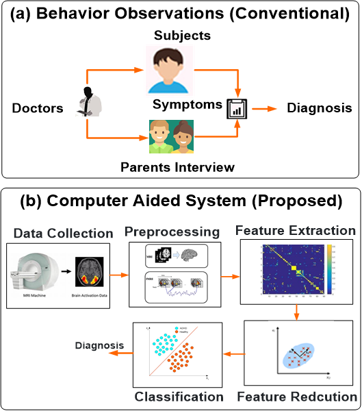 This study develops a computer-aided detection system for ADHD and its coexisting disorders by fusing features extracted from medical imaging (MRI/fMRI) with phenotypic and behavior-based biomarkers. Utilizing machine learning and feature selection techniques to identify the most efficient biomarkers, the project aims to overcome limitations of previous research, such as limited sample sizes and overfitting, to achieve better diagnostic performance.
